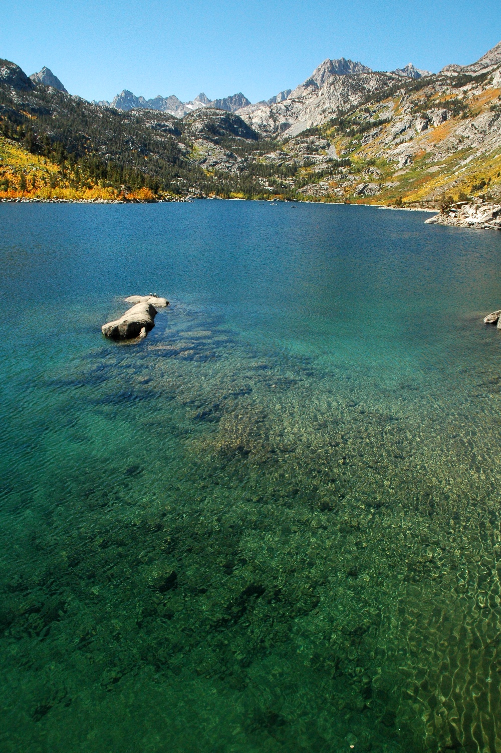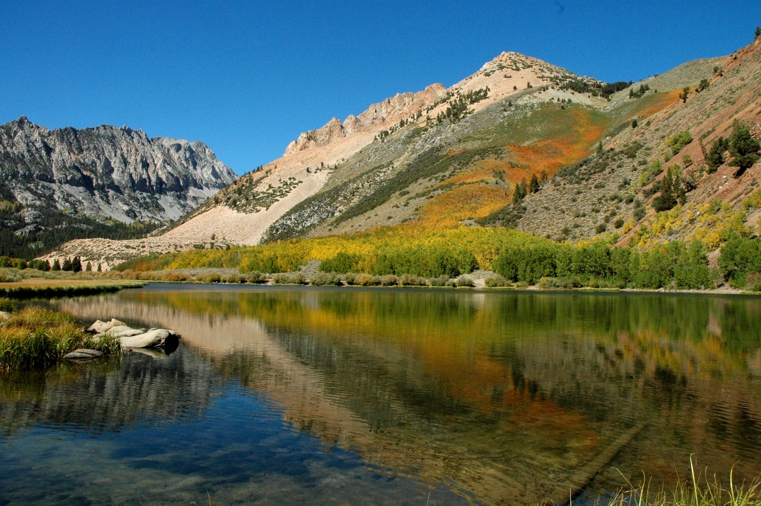 50-75% – Lake Sabrina (9,150’) – Again, Jared describes Lake Sabrina as “simply breathtaking right now as the yellows, oranges and even some reds are starting to show in a big way. The lake water level is also such that in the mid morning sunshine the water glows a brilliant shade of blue. The lake surface is often glass in the early mornings which, according to Rick Apted of Lake Sabrina Boat Landing, gives photographers a great chance of catching reflections of the aspens off the water. Weather permitting; it’s going to get even better in the coming week or so.”