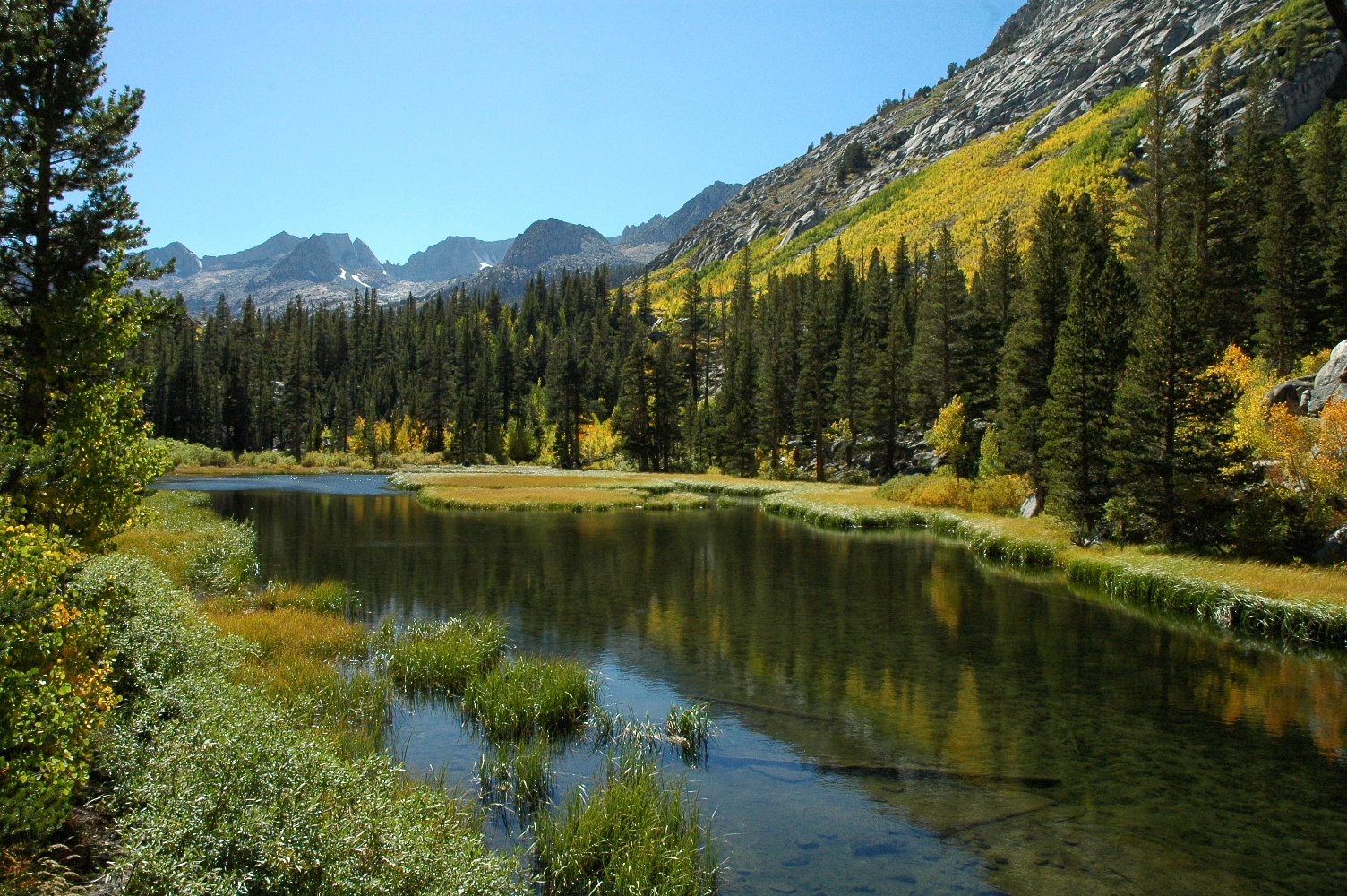 75 – 100% – Weir Pond (9,592’) – Color is “really beginning to pop at Weir Pond, possibly the most popular spot on the South Fork Bishop Creek to take photos. Last week the yellow had started up the mountain to the west but this week just about the entire grove is bright yellow and the lower aspens among the pines right by the water are lit up as well. The aspens on the east shore aren’t going yet so we still have some more color to look forward to here but it sure is looking great right now.”