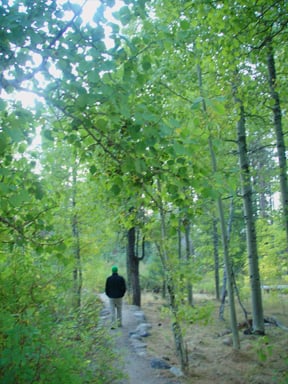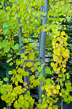 30-50% — Fallen Leaf Lake (6,377′). As seen in this moody image from the Lake Tahoe Visitors Authority, aspen on the trail to Fallen Leaf Lake are mostly lime-green with hints of yellow. To get to this lovely, secluded lake, follow the signs from CA-89 along the west shore, three miles north of the “Y” at the intersection of US-50 and CA-89 in South Lake Tahoe.