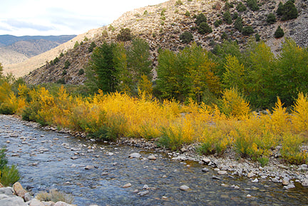 30-50% — Walker Canyon (5400′ – 6000′). Aspen, Cottonwoods and Willows are starting to turn. Aspens and Cottonwoods are showing green to lime green to light yellow. Willows are half green and half yellow.