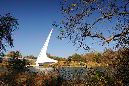 50-75% — Redding. The capital of “Upstate California” is nearing peak for its seasonal color, particularly in neighborhoods and city parks. At Santiago Calatrava’s magnificent Sundial Bridge, native oaks and riparian trees provide some changing colors by which to frame the bridge’s impressive gnomon. Even though the color here is not of the dramatic nature of that to be found in the Sierra, there’s still lots of color if you look for it and Sundial Bridge is worth the drive north.