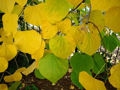 Fall color has now dropped in elevation to sea level. Exotic trees are showing first, as can be seen in these photos of Chinese Pistache (pistacia chinensis) and Eastern Redbud (Cercis canadensis) photographed at 800′ in El Dorado Hills.