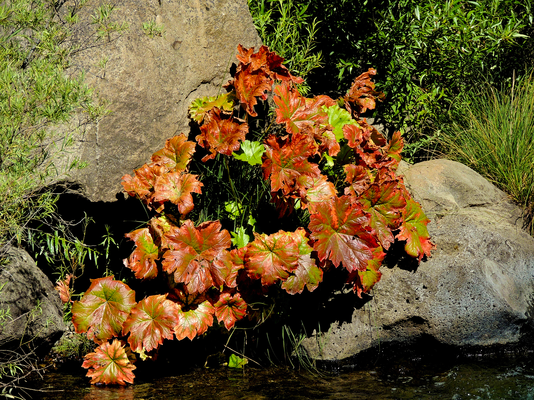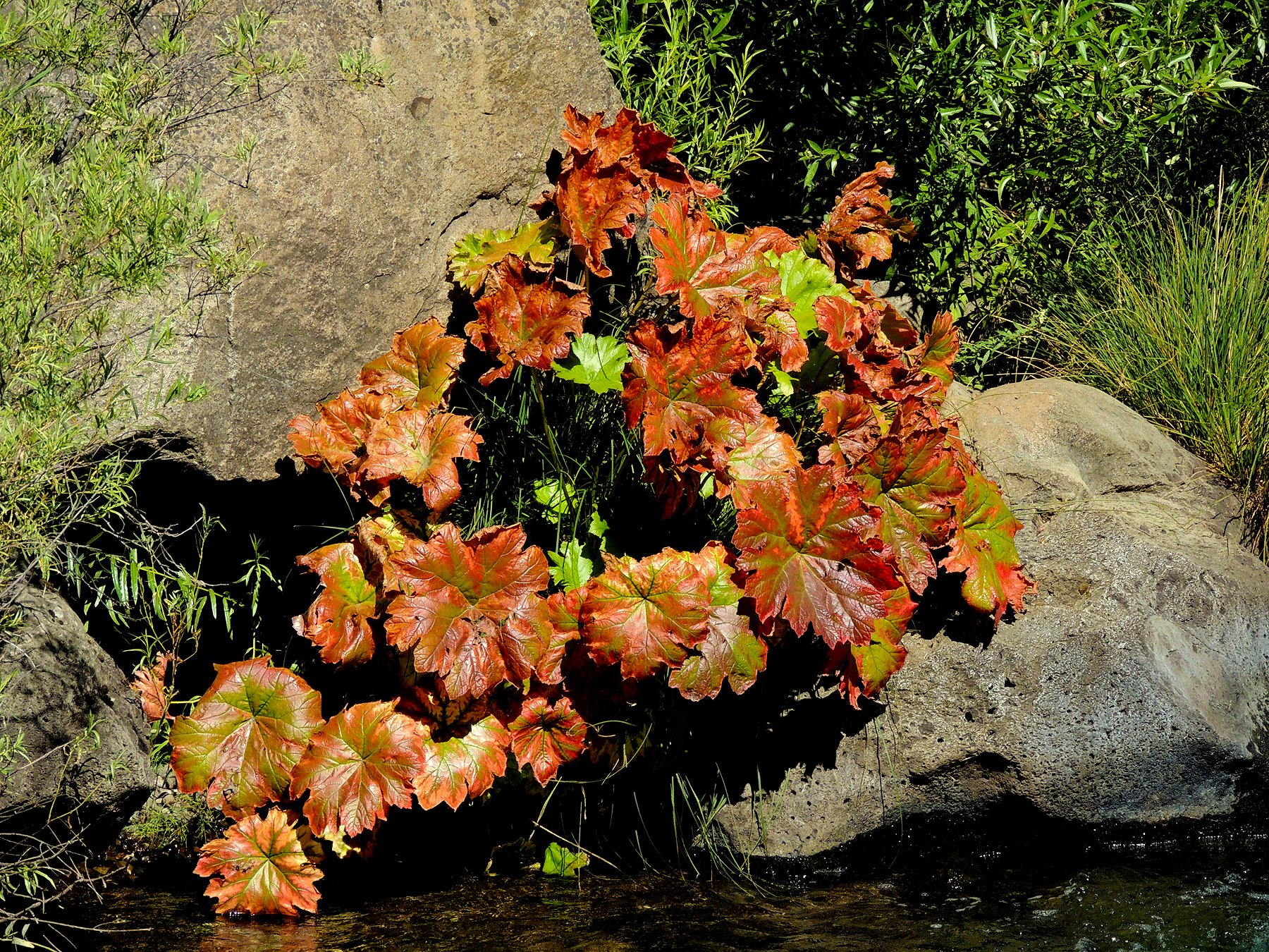 Color spotter Richard McCutcheon sends this lovely spot of color seen yesterday in Butt Creek (Plumas County) and reports, “Could not believe it on Aug 1st, Indian Ruhbarb turned on Butt Creek.”