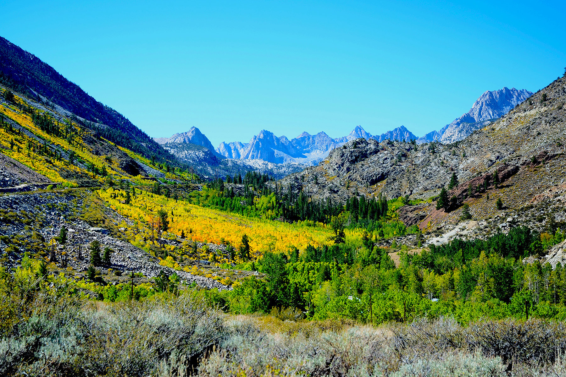 15 – 30% – Overall Conditions below 8,500 ft – The vast majority of aspen below 8,500 ft are still mostly green, though a lot of lime green is showing with some pockets of yellow, especially on the So. Fork Bishop Creek above Bishop Creek Lodge.