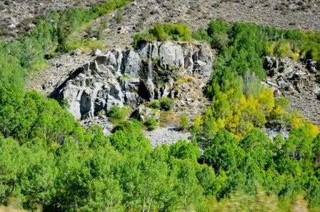 30 – 50% – Willow Campground (9,100 ft) – This area is difficult to grade because the aspen along the road and in the campground are only showing lime green and some moderate yellow while the aspen perched in the granite cliff just above the campground are nearly all yellow and looking beautiful. The hillside above Parchers looks incredible from Willow Camp and contrasts nicely with the green aspen along the road.