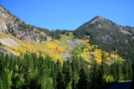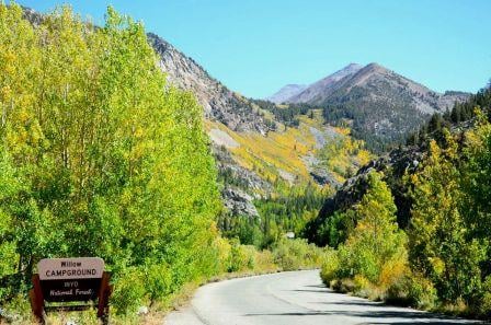 30 – 50% – Willow Campground (9,100 ft) – This area is difficult to grade because the aspen along the road and in the campground are only showing lime green and some moderate yellow while the aspen perched in the granite cliff just above the campground are nearly all yellow and looking beautiful. The hillside above Parchers looks incredible from Willow Camp and contrasts nicely with the green aspen along the road.