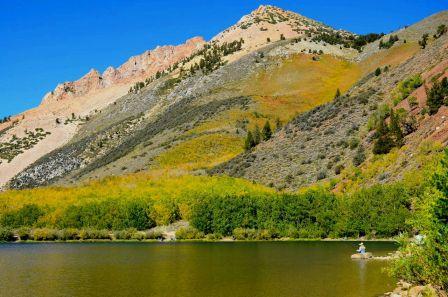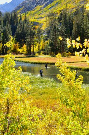 Fall color is early and big up Bishop Creek Canyon, with an exceptional display of orange and red appearing.  We spoke with color spotter Jared Smith of the Parcher’s Resort, today, who said “I can’t recall a year when the fall color peaked this early.”  His latest report (following) and photos tell it all.  Note the number of fly fishermen and women either floating or standing in various streams (look closely).  What incredibly beautiful places to go fishing!