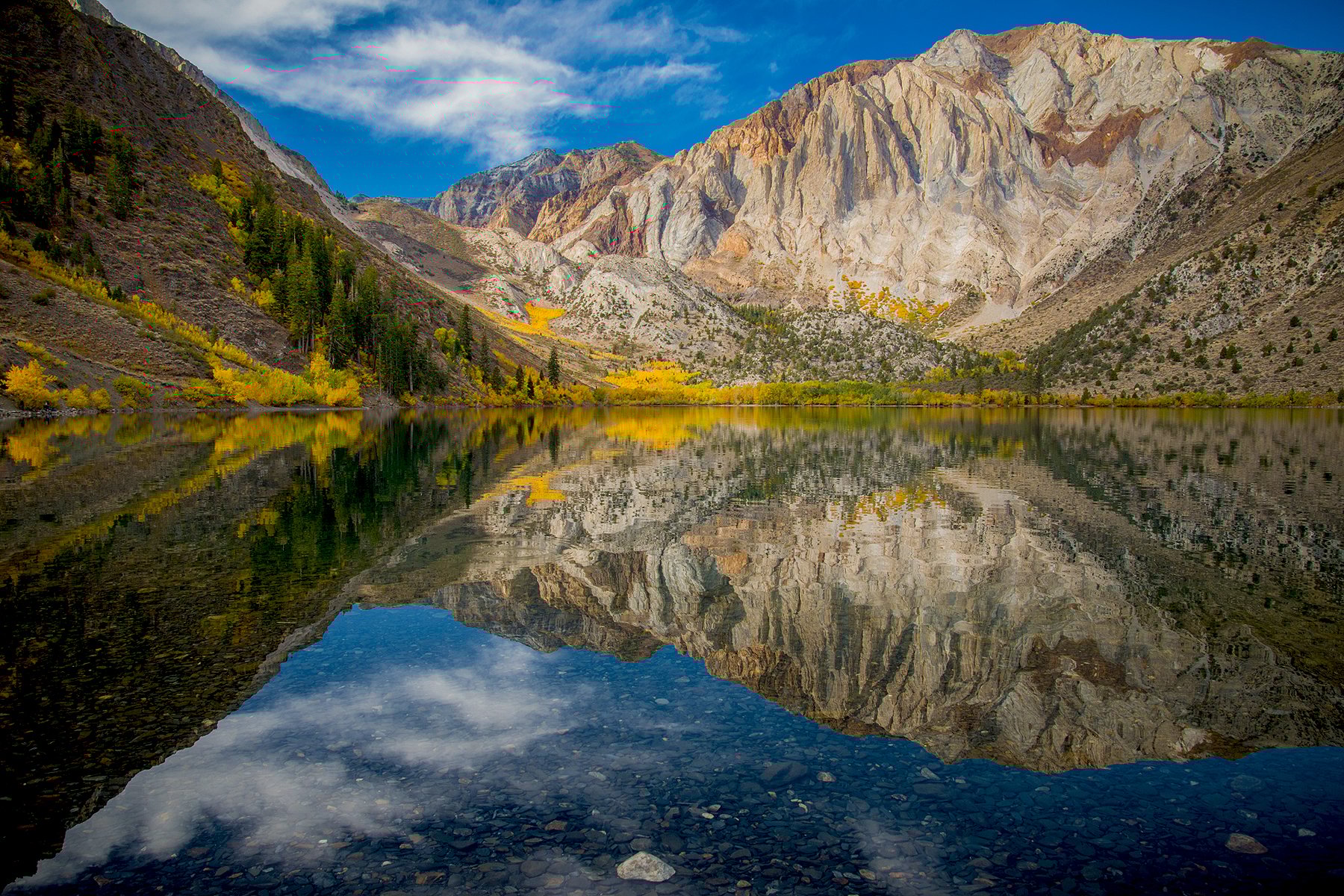 On reflection, Convict Lake – south of Mammoth Lakes- is picture-perfect, presently.  Color spotter Christie Osborne reports that color has now descended to 7,000′ in elevation approaching full peak at Mammoth Lakes.  Weather has been ideal with temps in the 60s and no wind. Nights remain cool in 20s and 30s, providing for optimal conditions to intensify fall color.