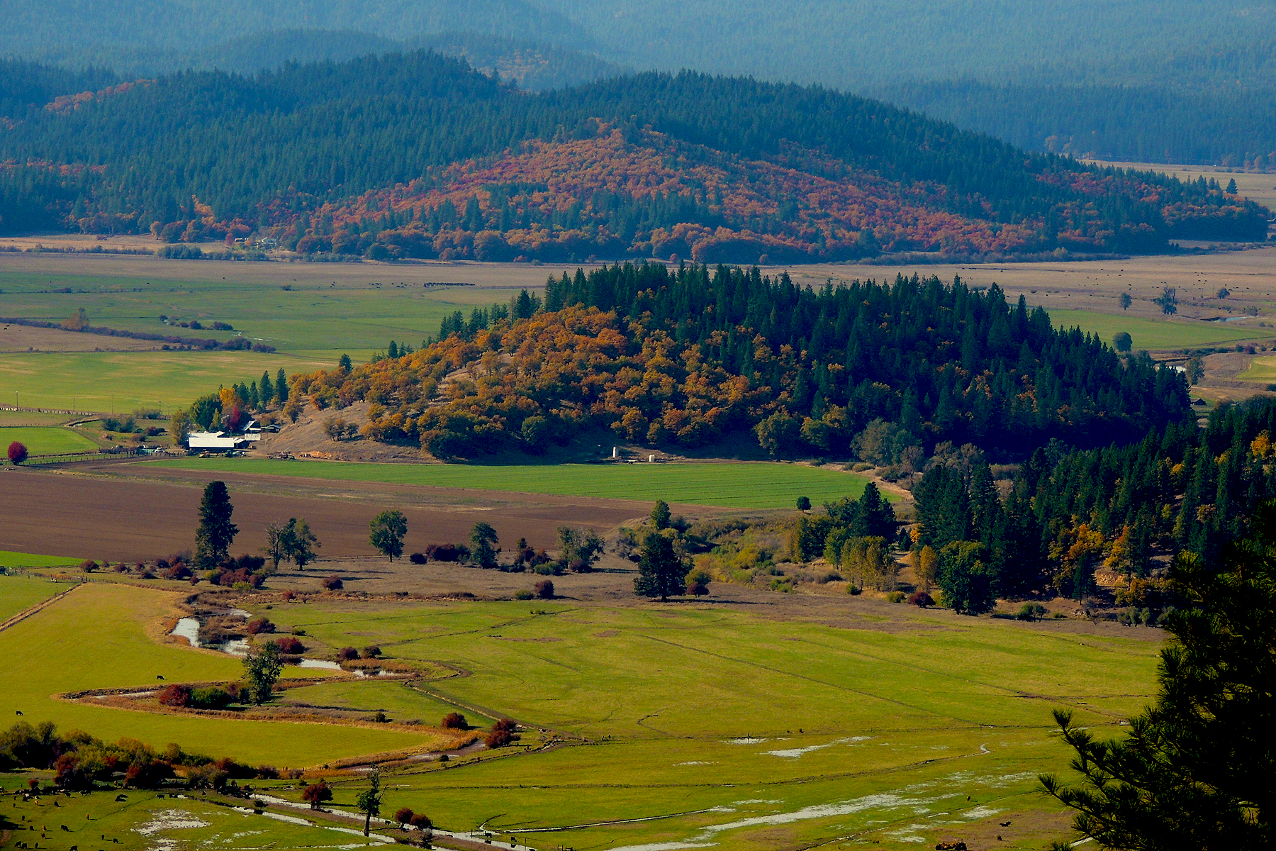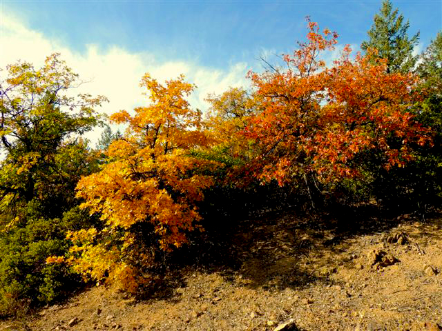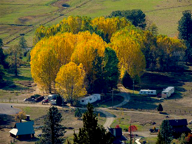 Color spotter Richard McCutcheon sends these photographs of cottonwood and oaks colored up at full peak in Plumas County, near Taylorsville. California’s oaks have lovely, though subtle color at peak. It’s often difficult to catch the oaks all turned at the same time, since they tend to change little by little over the weeks. Richard’s aerial perspective is a new one that shows the full change of the trees, looking down on them. Bravo, Richard.