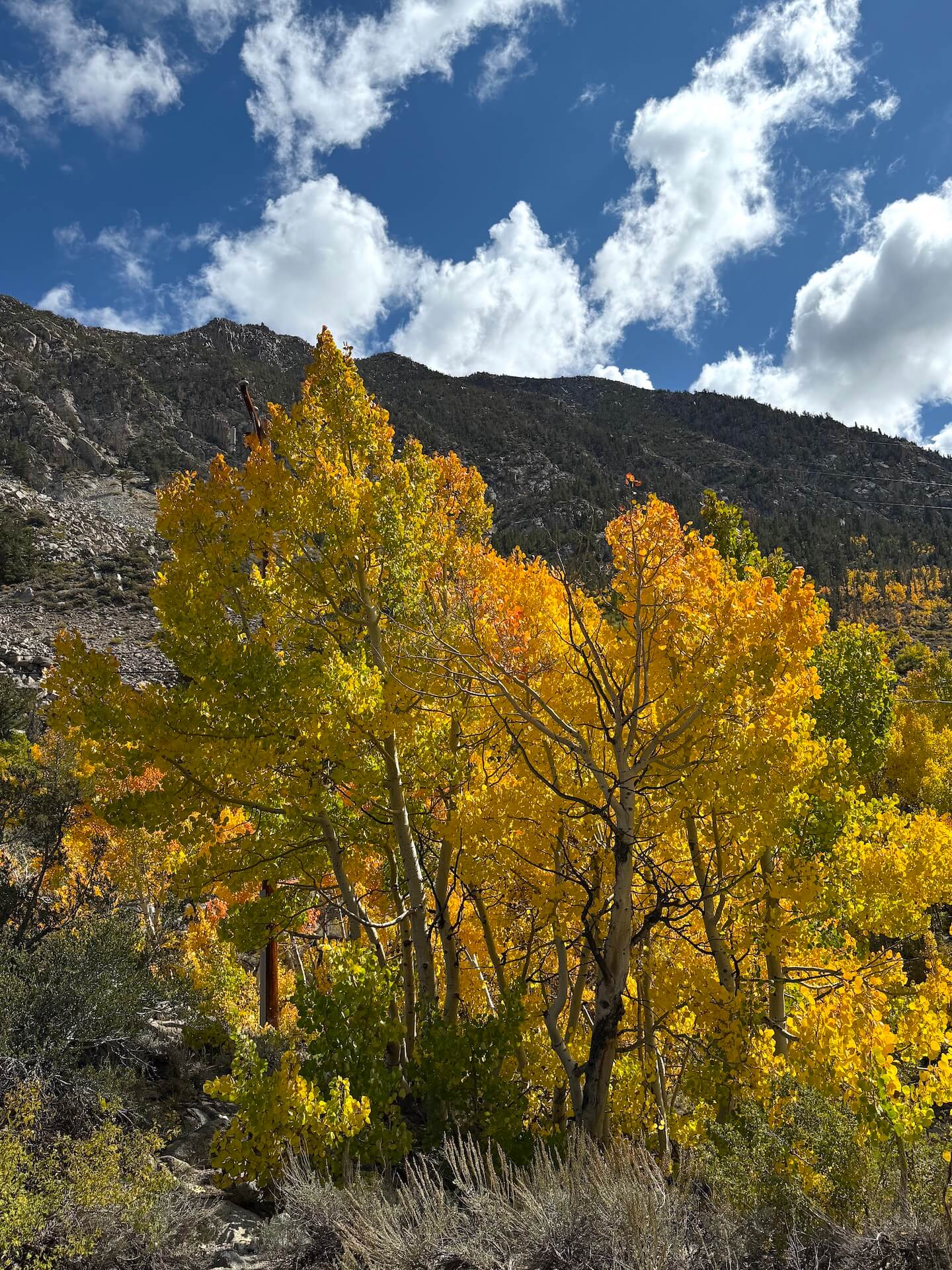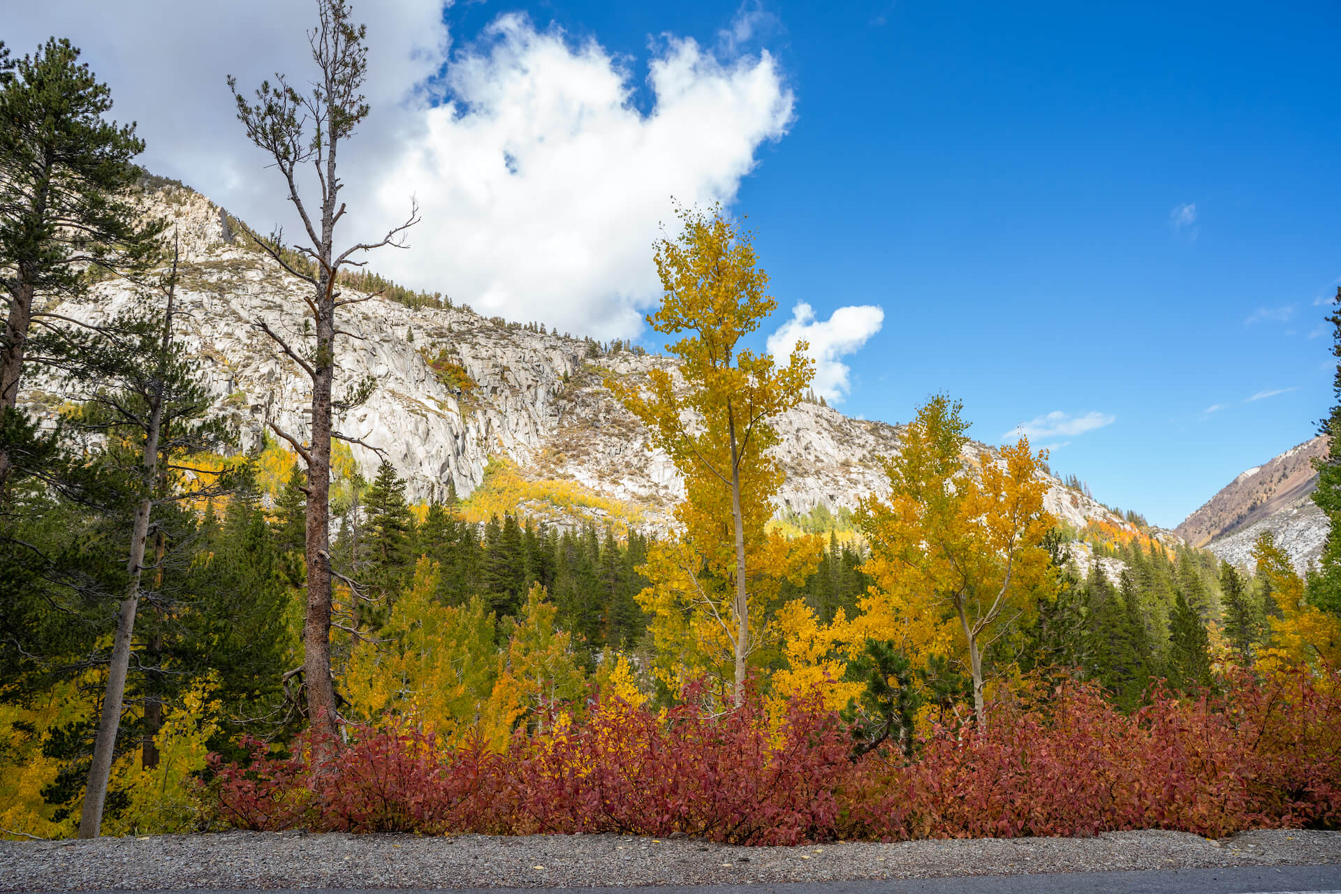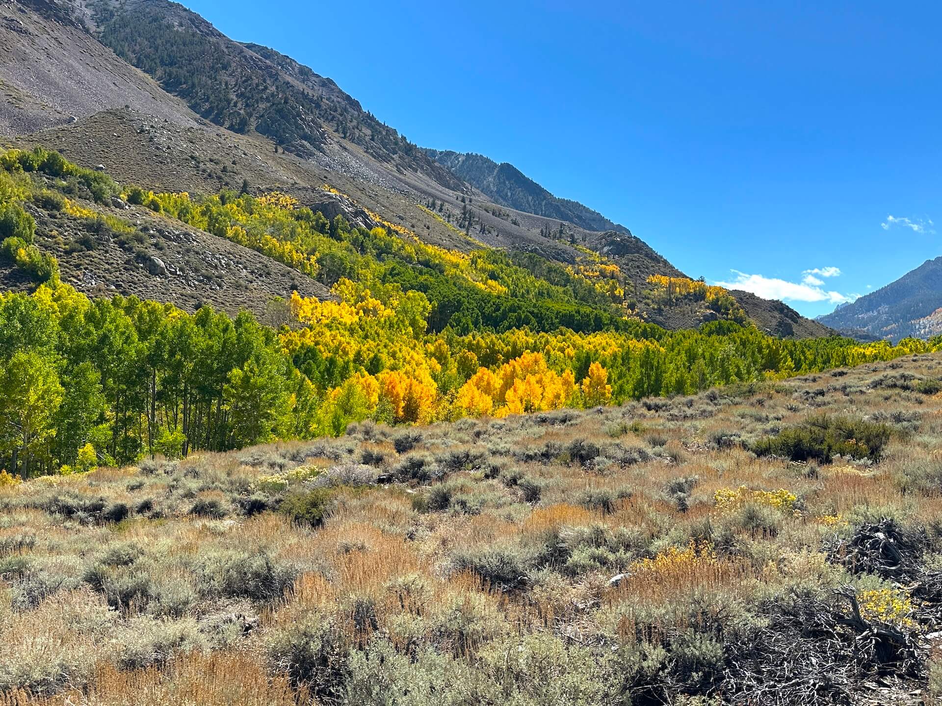 The fall colors are in full effect in Bishop Creek Canyon. There are a variety of colors, from yellow and orange to red, and yet, quite a number of aspen stands that are completely green.