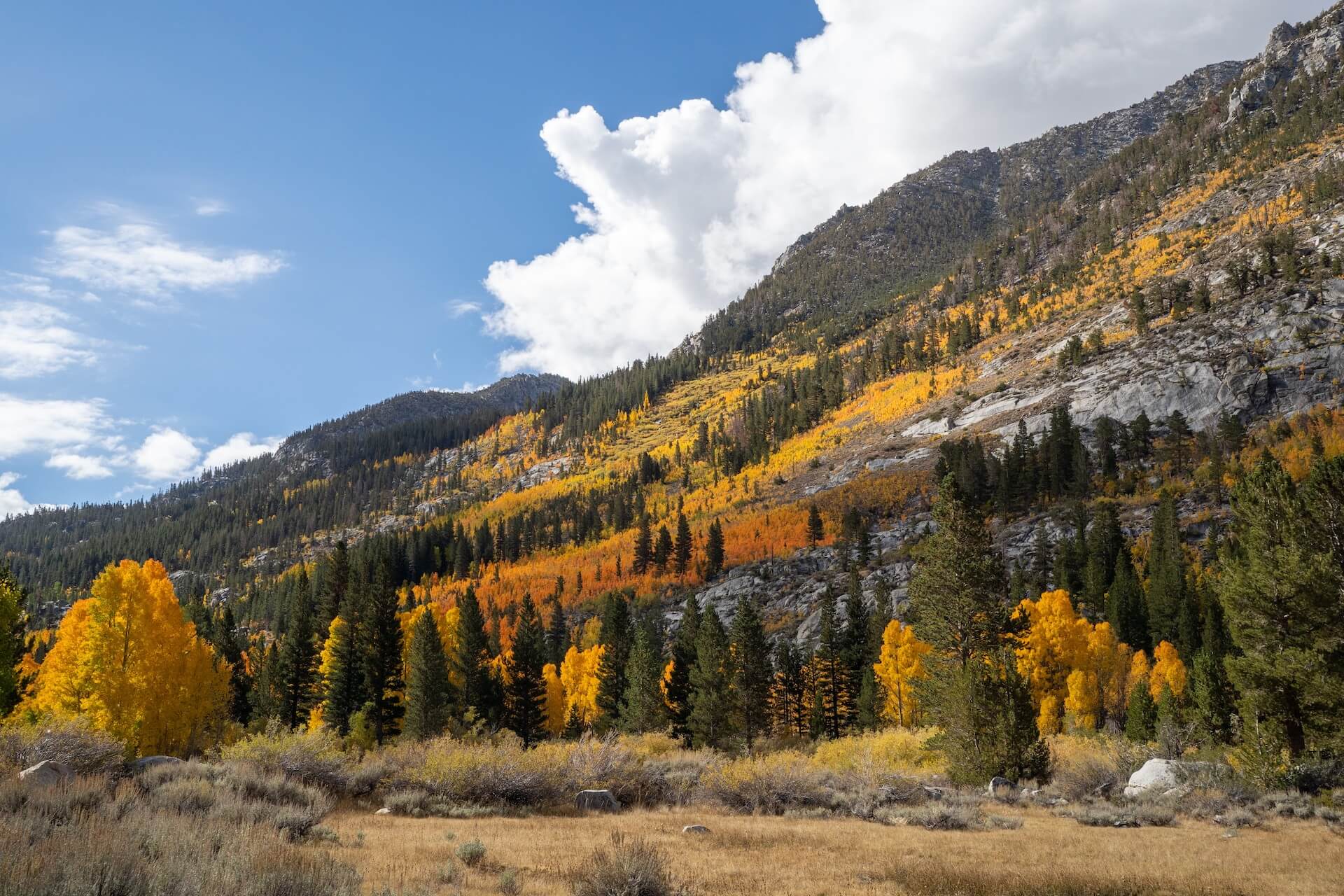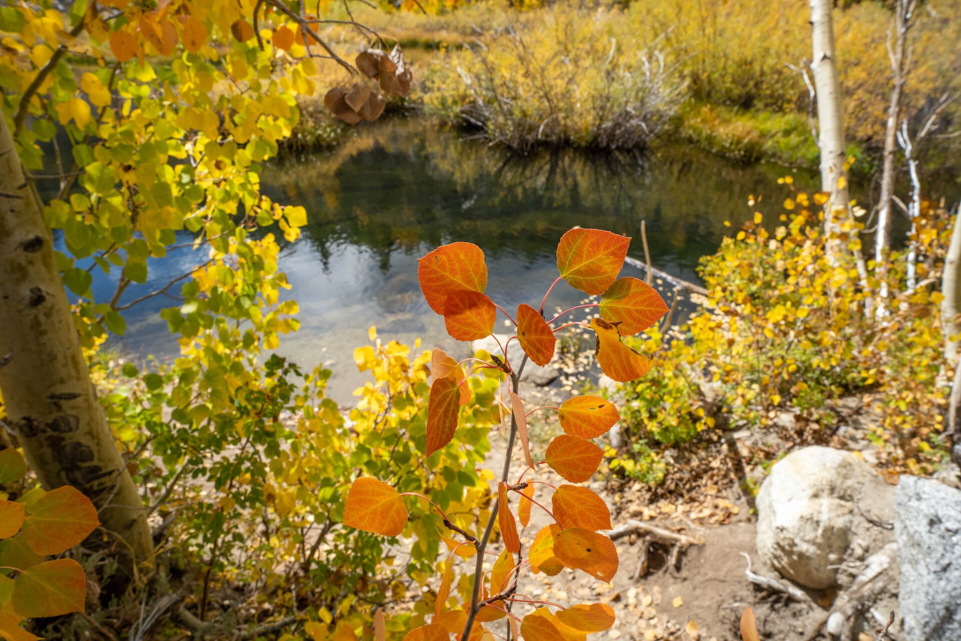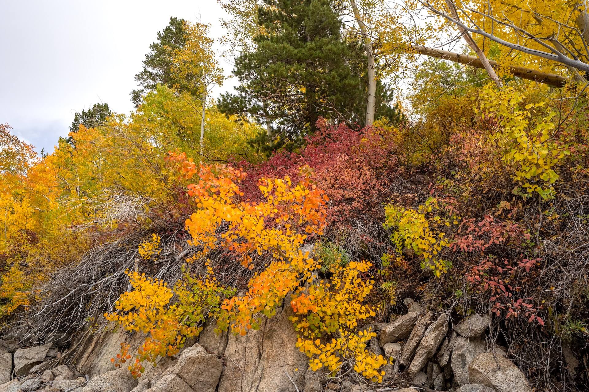 The fall colors are in full effect in Bishop Creek Canyon. There are a variety of colors, from yellow and orange to red, and yet, quite a number of aspen stands that are completely green.