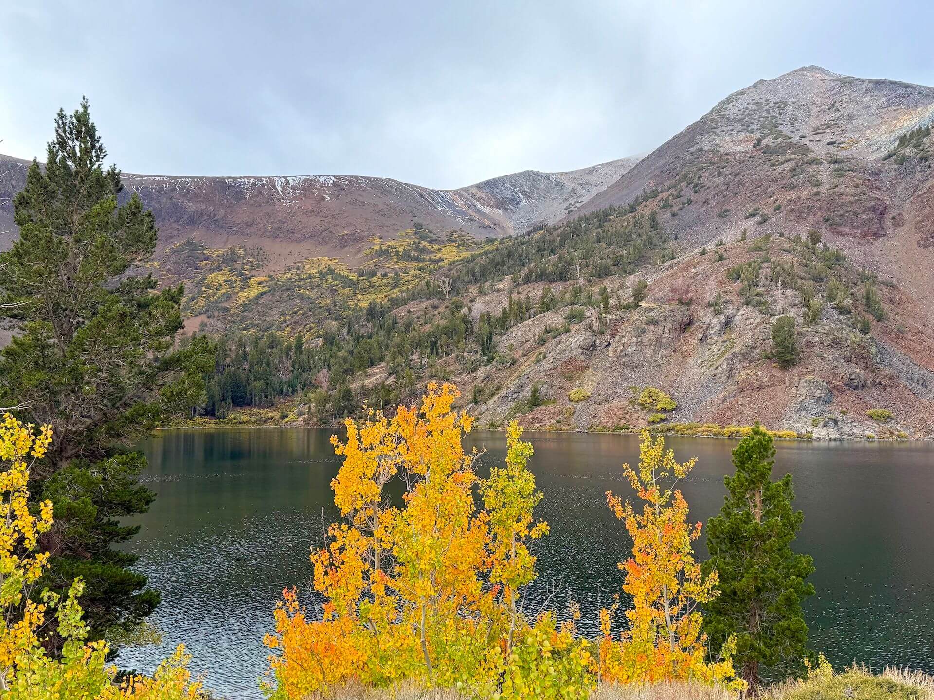 Virginia Lakes (9,819’) — 50-75% Near Peak (Go Now.) Virginia Lakes is glowing in shades of gold, with some groves already beginning to shed their leaves. Along the creek in the lower areas, the landscape is a vibrant mix of mostly yellow and gold, with a few hints of orange — and very little green remaining. A small, fresh dusting of snow on the mountain above the lake adds to the magic of the scene. It was about 45°F here this afternoon, and cooler temperatures could accelerate changes in the days ahead.