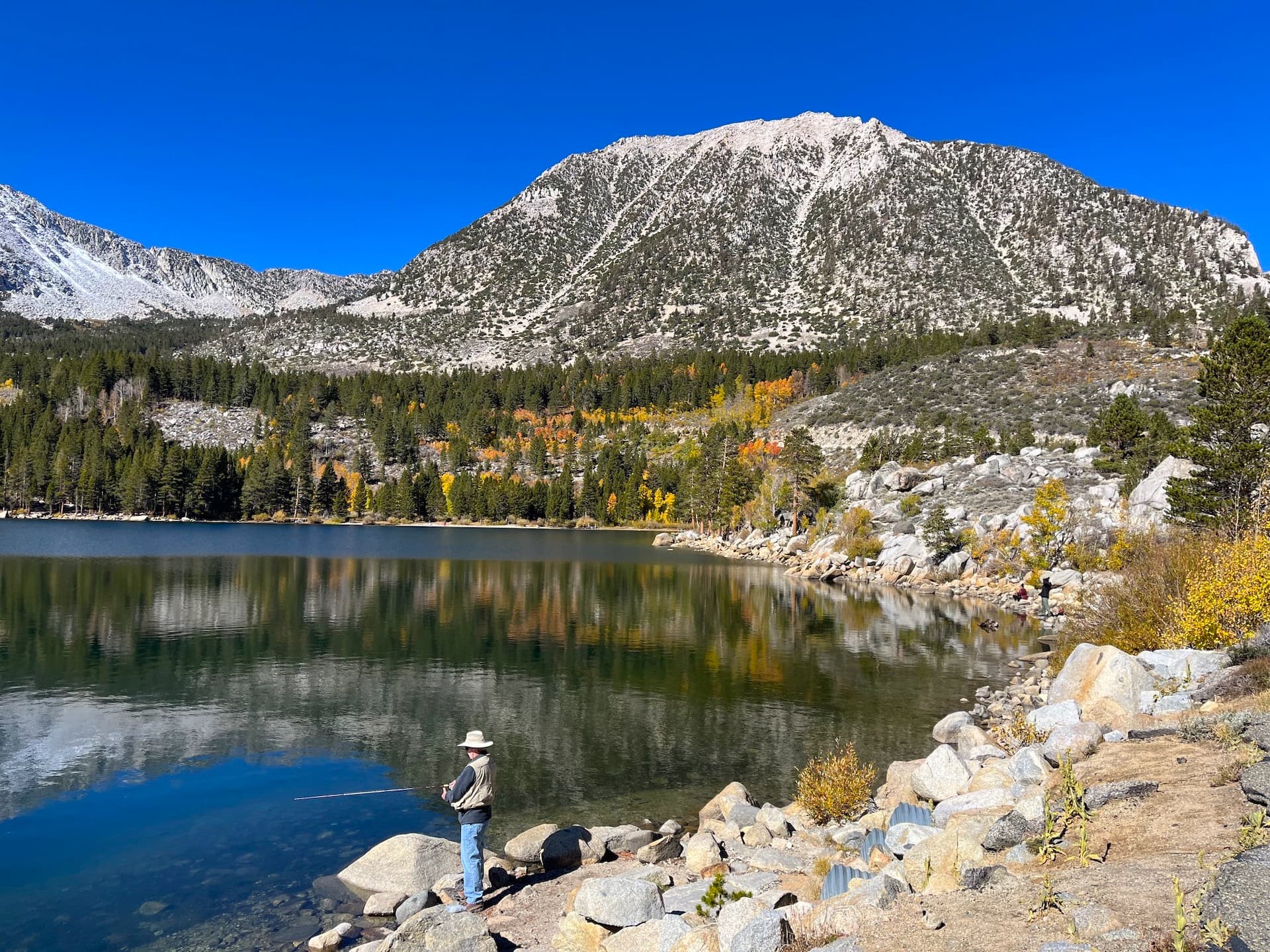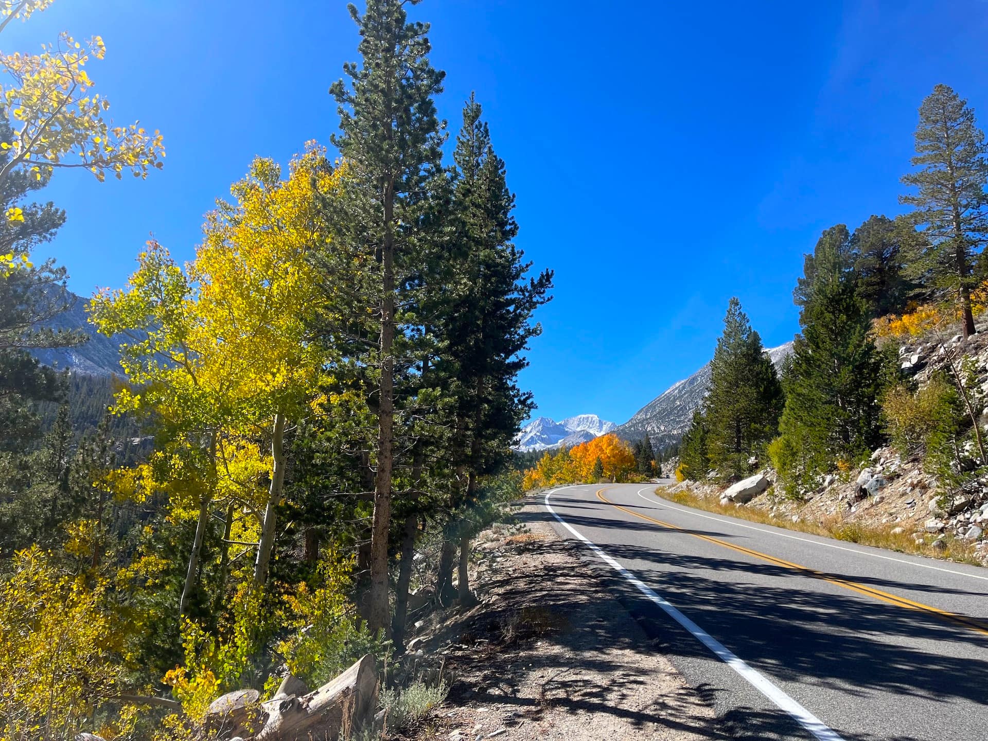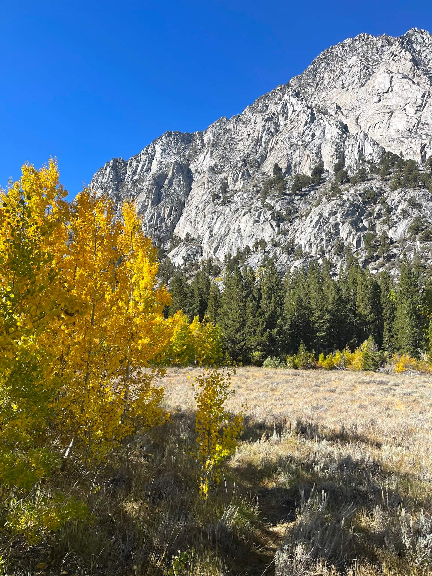 Last week’s wintry weather in the Eastern Sierra took a toll on Rock Creek Lake and Canyon. While pops of color remain along the road and some around the lake, many trees, especially on the road up to Little Lakes Valley Trail are past peak – stripped of their leaves or showing bunches that are turning black.