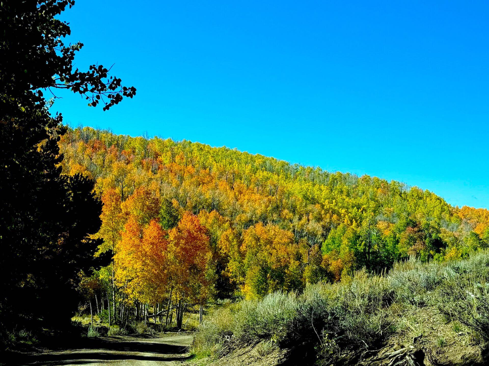 This area has jumped to 50% with a vibrant mix of green, yellow, gold, orange, and even hints of red creating a technicolor landscape. Cooler temperatures and a possible storm next week could bring rapid change, with the upper meadow likely peaking soon. Beyond that point, the road becomes steep and rough – be prepared if you venture that far.