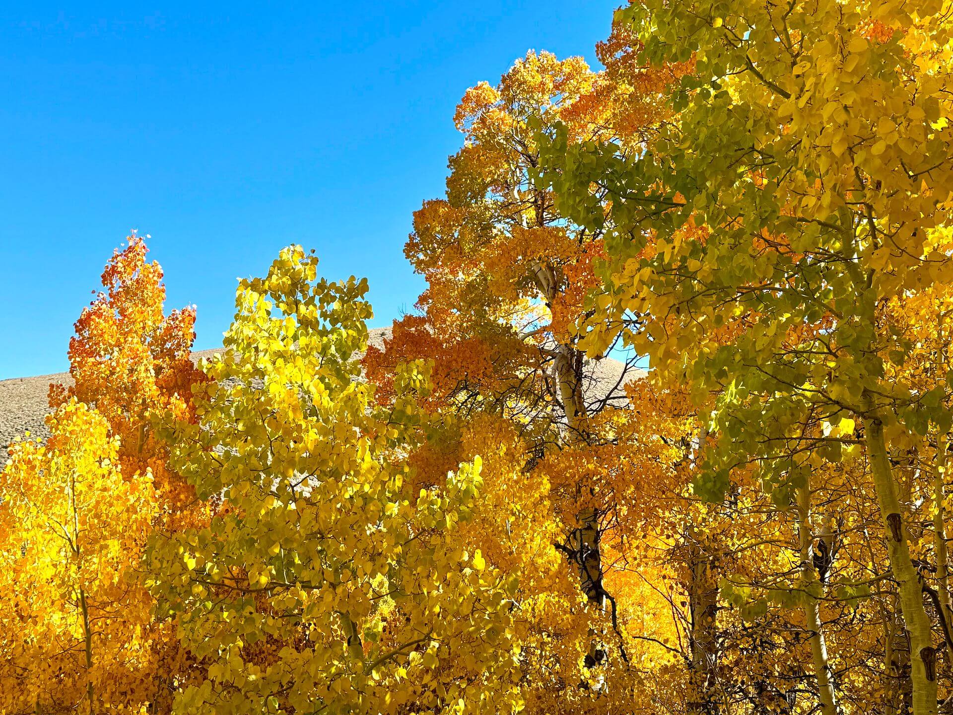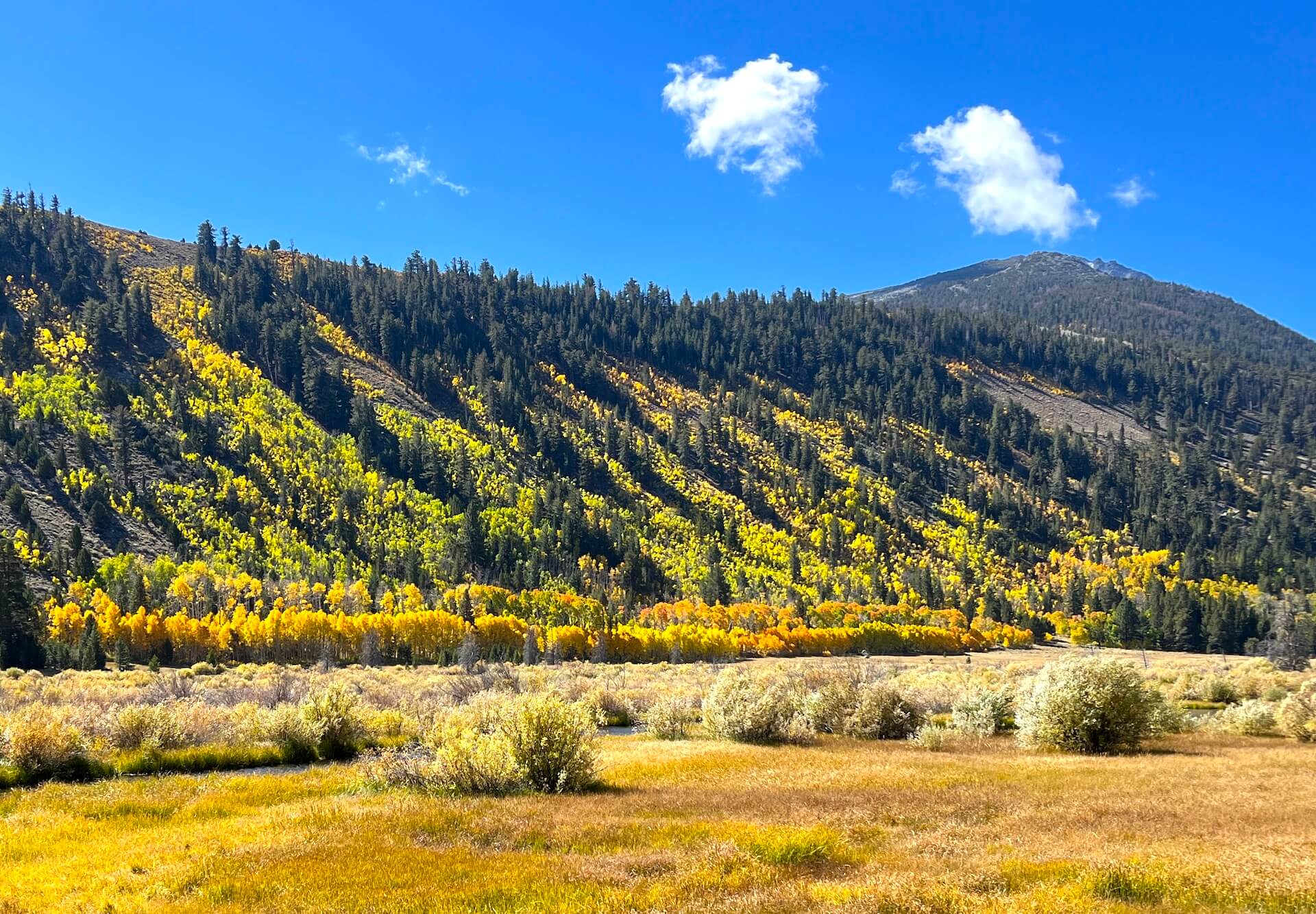Lee Vining Canyon (6,781′) — 50-75% Near Peak (Go Now.) -Lee Vining Creek has some thick groves of yellow and orange near the water and around the meadow. However, it still has a way to go with many patches of green still hanging on.