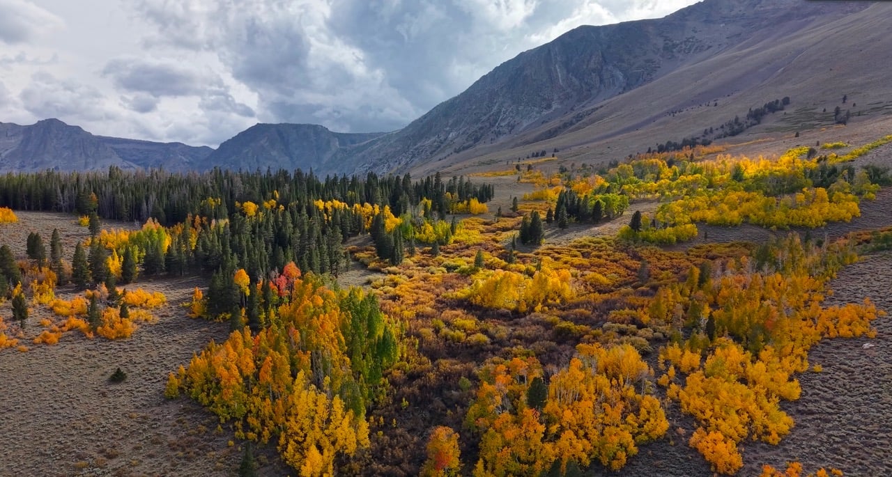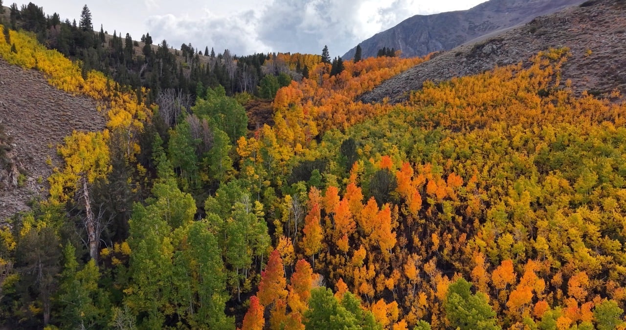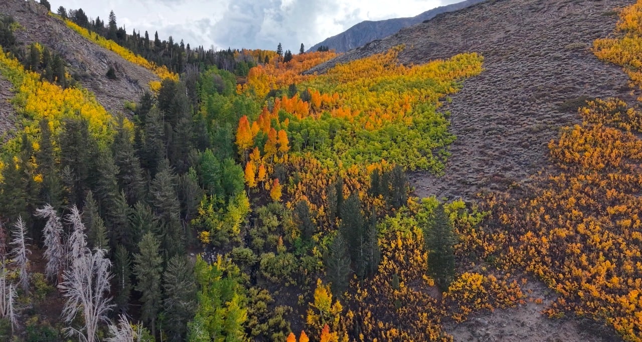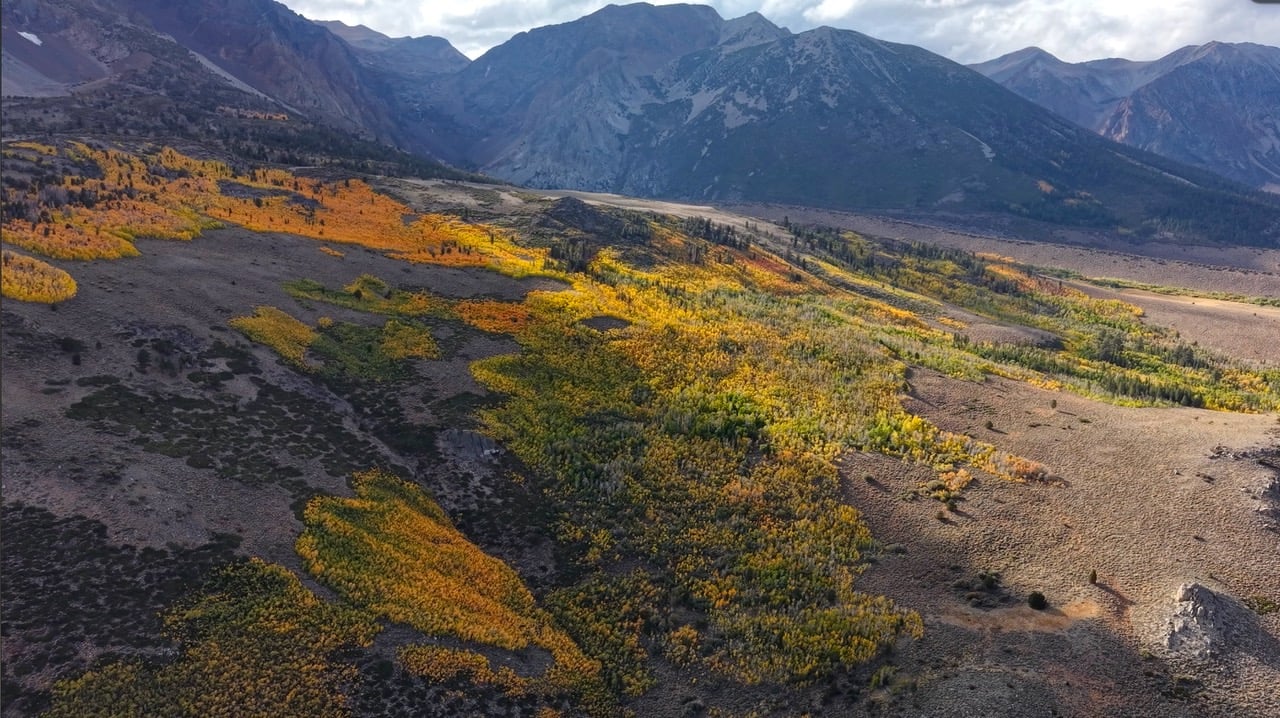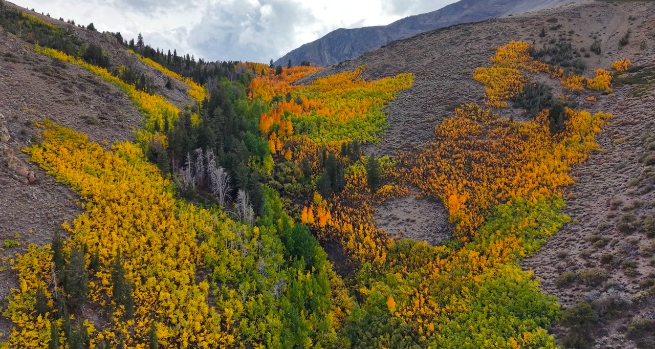 The north end of the June Lake Loop is bursting with peak color on the mountainsides, while other areas are just beginning to turn. This seems to be the common theme of 2025 – some areas of a location are patchy while others are at peak.