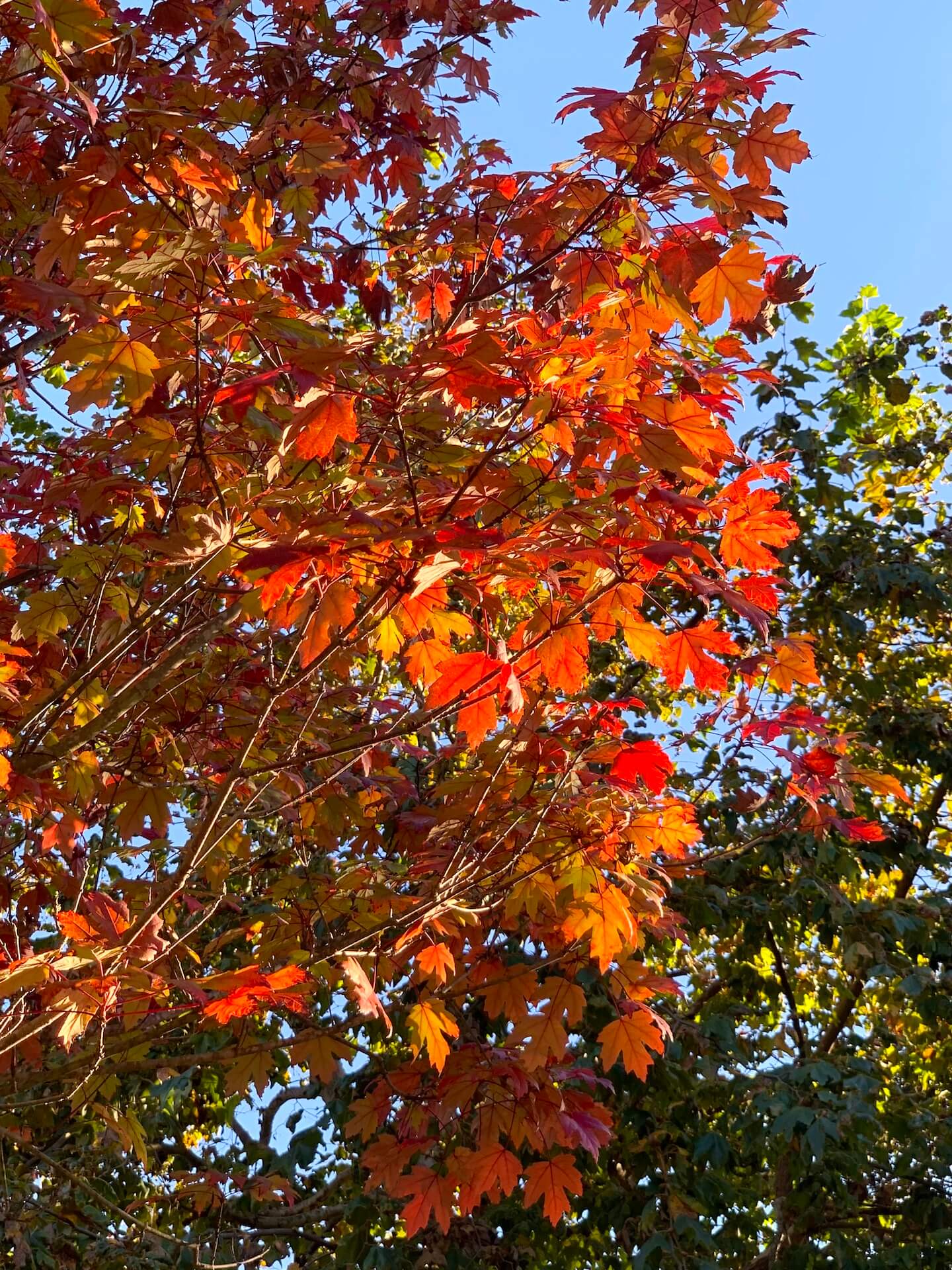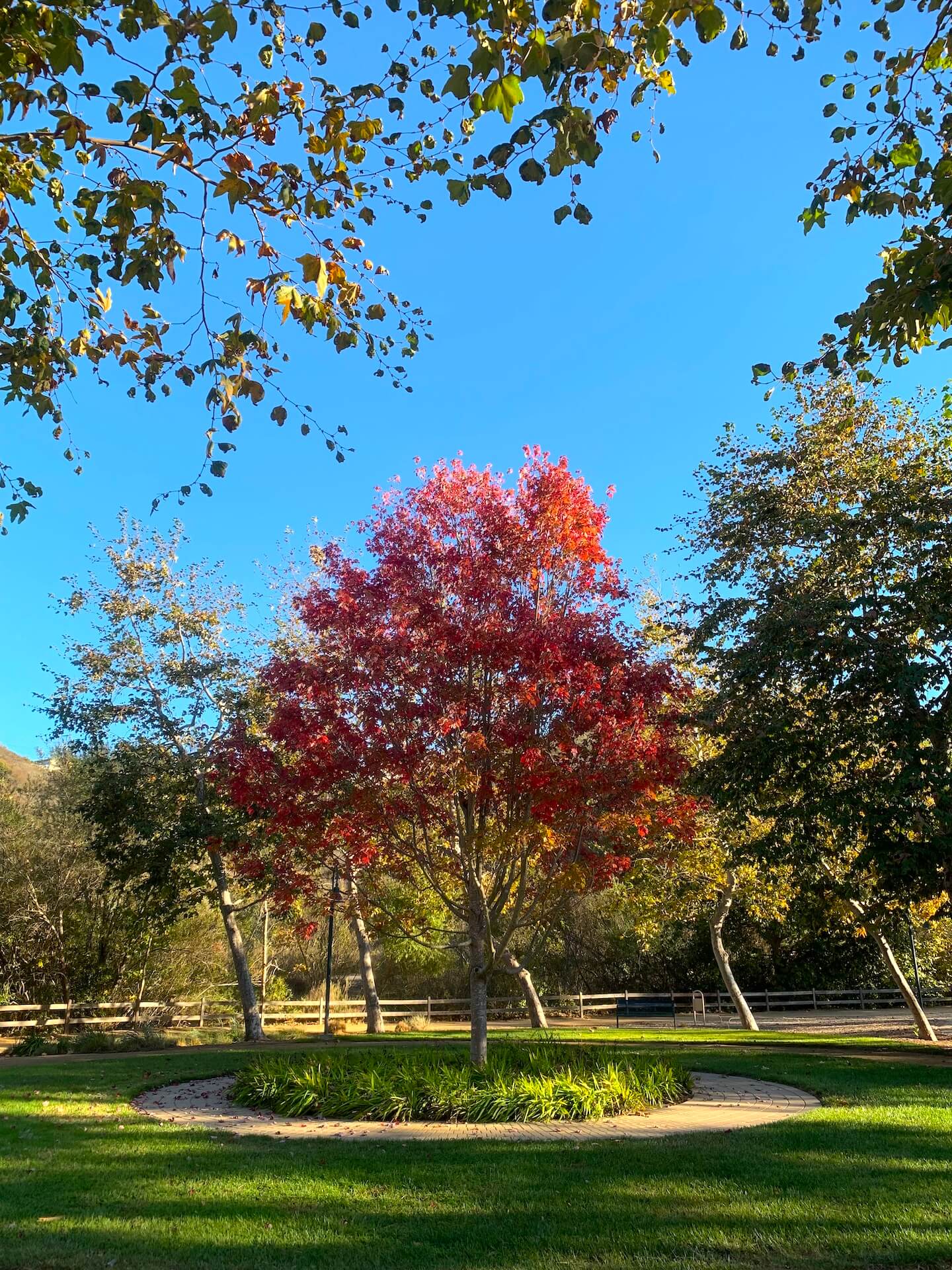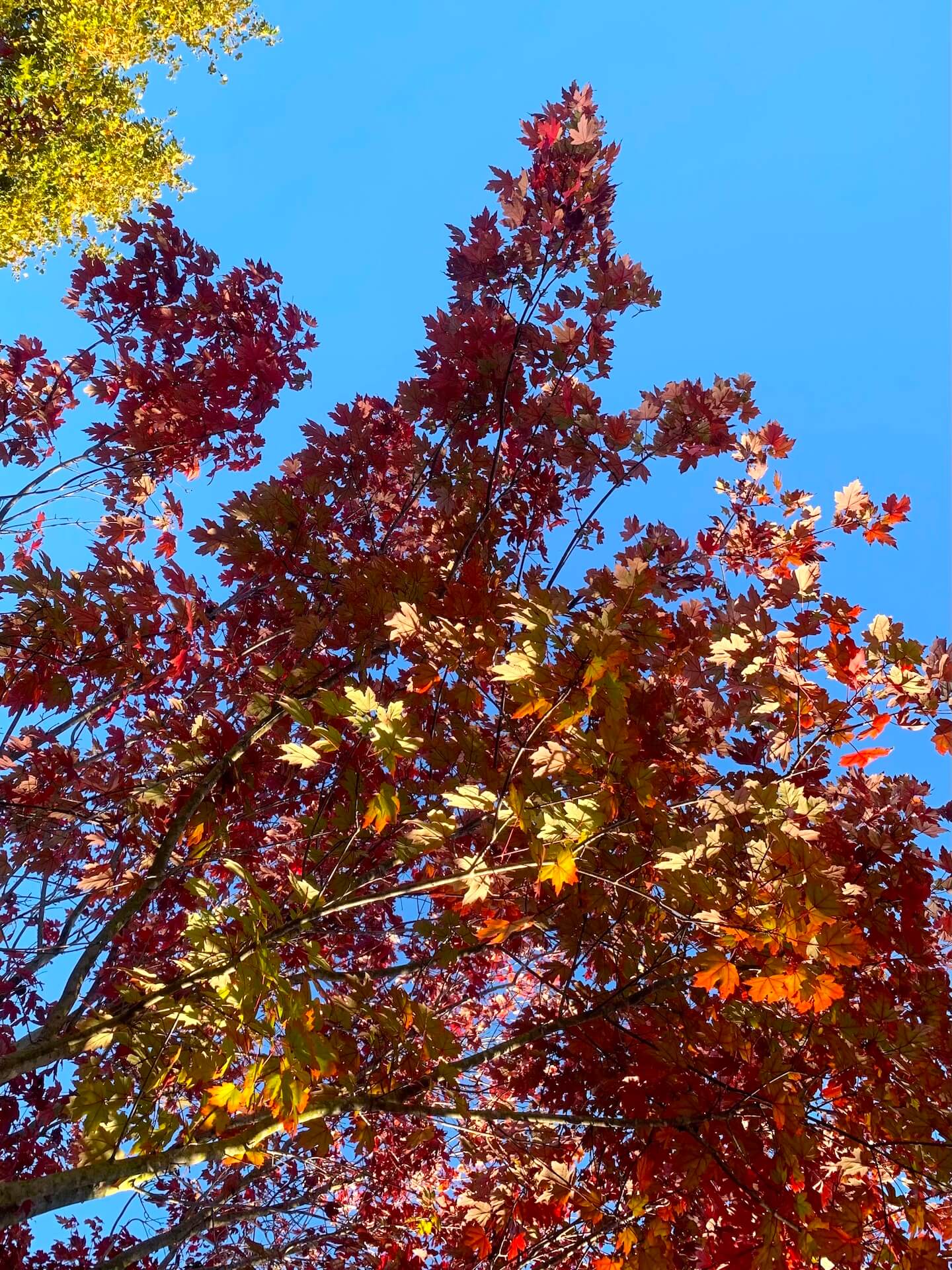 Oct. 17 – “This beautiful crimson red leaves tree stood there surrounded by the other trees with golden or green color leaves, almost like a King or Queen. The colors became even more vivid as I moved to the other side facing the sun. “