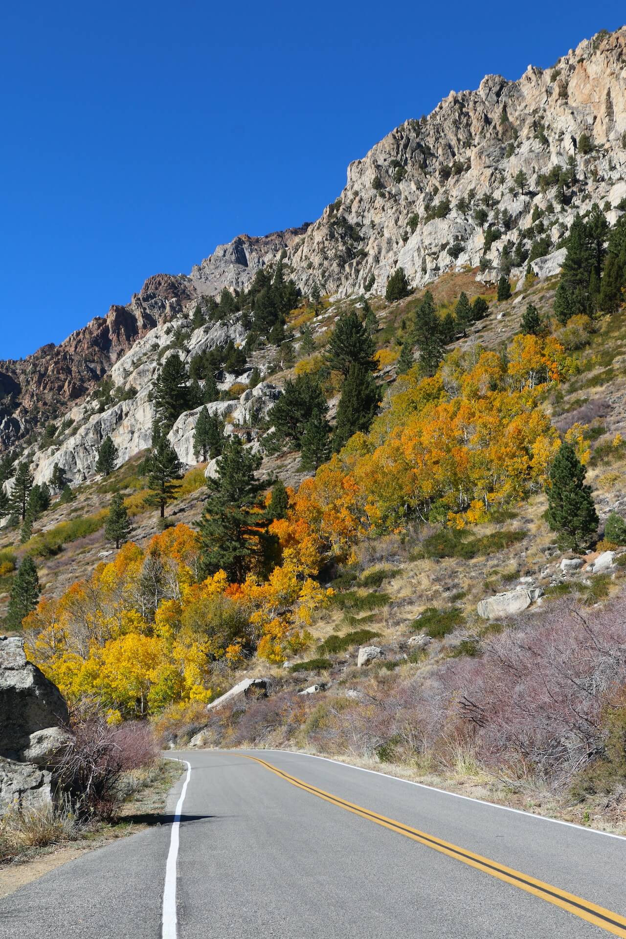 Colors are at their peak along this scenic stretch below Tioga Pass, where aspens line a creek within the canyon with towering granite cliffs. Please use caution and watch for work vehicles in the area.